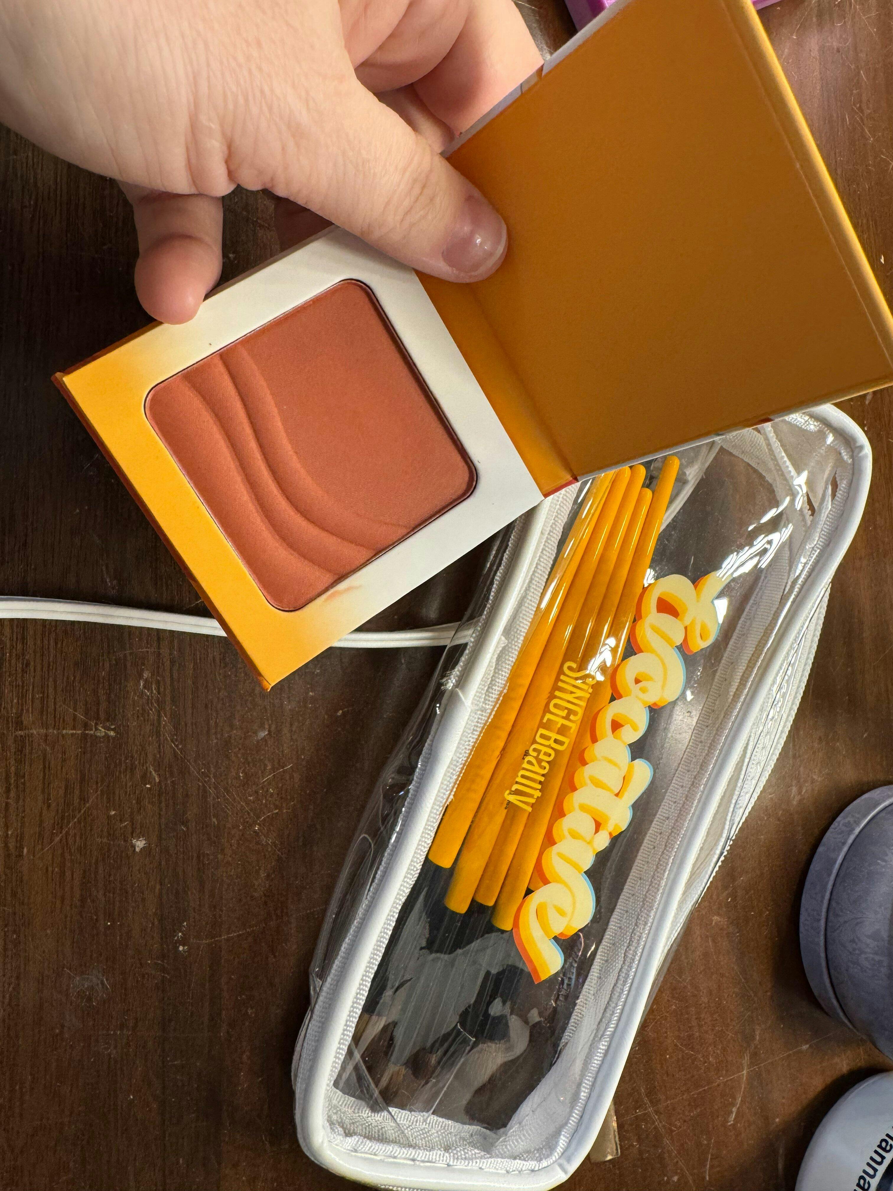 Each brush is vegan and made with synthetic fibers to emulate real hair bristles. The handle contains aluminum ferrule and wood, painted with the signature Singe orange color.